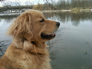 street, I, dressed for bear, he, golden fur flying; I, with tentative steps, he, with